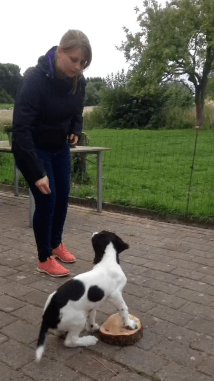 Det er meget bevidst, at jeg klikker når han er på stubben, men giver godbidden væk fra stubben. Årsagen er, at det ikke er meningen, at han skal komme til at sætte sig, som han er vant til fra platformen, og i starten ønsker jeg bare en kort markering. Senere kan jeg trække tiden lidt, før jeg giver klikket og på den måde lærer han at blive til nyt signal er givet. Dette kan også kun gøres, fordi han forstår at klik=godbid. Havde jeg kun brugt godbidder, ville jeg være nødt til at give dem på target, fordi det ville være markeringen af den korrekte adfærd. I det her tilfælde bliver klikket en markering af adfærden som fører til belønningen (godbid). Derfor er klikker bare et super redskab – den giver mulighed for at markere en adfærd meget præcis, selvom den foregår på afstand fra fører.